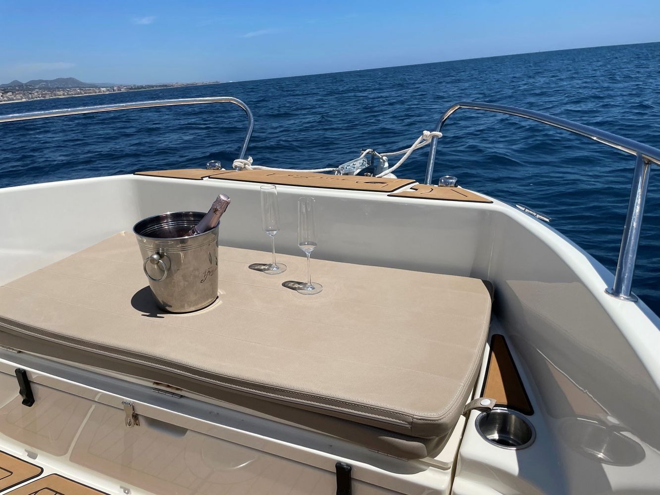 La embarcación cuenta con toldo para los días de más calor, escalera de baño por si queréis daros un chapuzón en mar abierto, un espacio habilitado en proa como solárium, una mesa, altavoces y la posibilidad de traer a bordo comida y bebida.