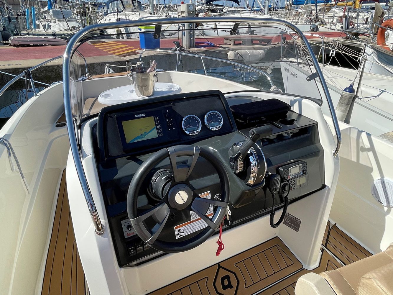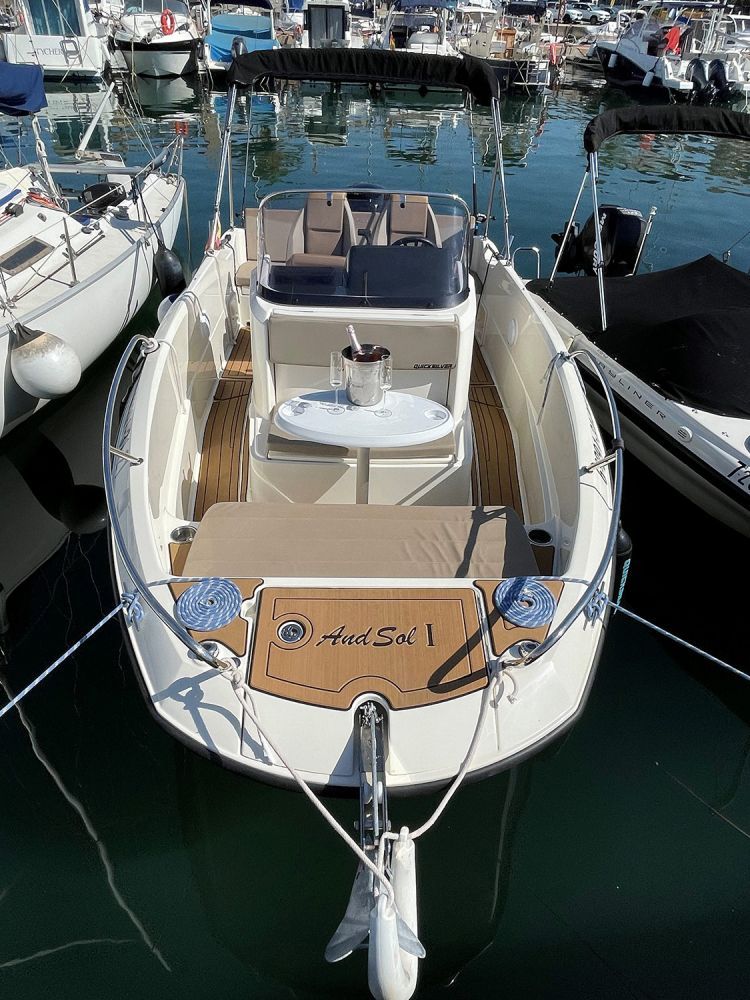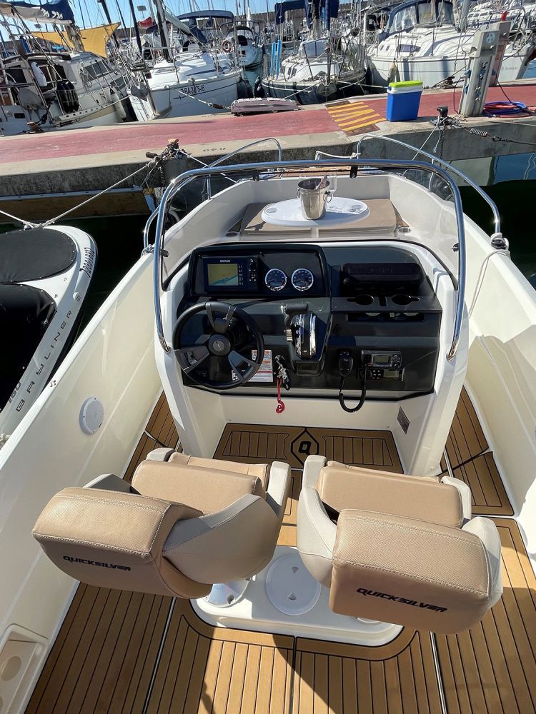 Entre nuestras embarcaciones, puedes disfrutar de la lancha Quicksilver Activ 605 Open, con 150 CV de potencia, que tiene capacidad para seis personas con patrón o siete si no lo necesitáis.